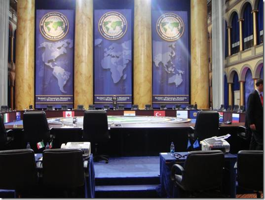 As you can see, the G-20 actually includes 19 States, plus the European Union. The meeting also included the heads of the major international financial institutions (IFIs, pronounced “IF-ees”): the International Monetary Fund (IMF), the World Bank, the U.N. Secretary General, and the Financial Stability Forum. In addition, the final summit meeting included the heads of Spain and the Netherlands.