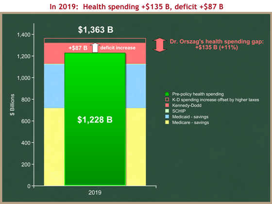 Let’s add the proposed new health spending in the Kennedy-Dodd bill, as scored by CBO. You can see it would significantly increase federal health spending.